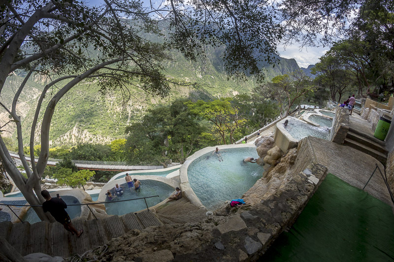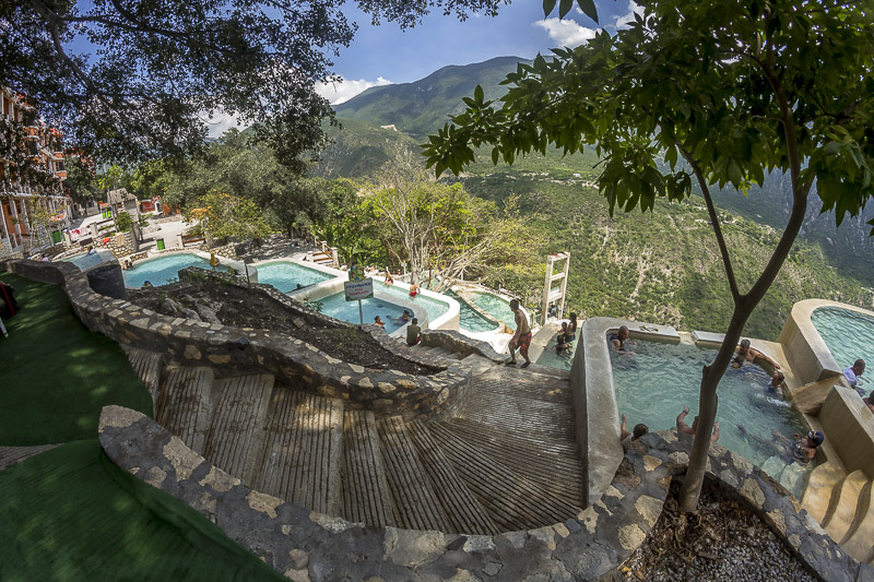 on gare la voiture sur un parking prêt de l’hôtel, et on s’engage à travers une série de bungalows qui donnent sur les baignoires. Vu la route ca doit être cool de dormir la avec un spa a vos pieds, au milieu des palmiers et de végétation, accroché sur un pan du canyon. On a regarde en rentrant les prix des chambres est d’environ 800 pesos la nuit soit une trentaine d’euros. A ce prix la pas de WIFI, pas TV mais un cadre et une vue imprenable.