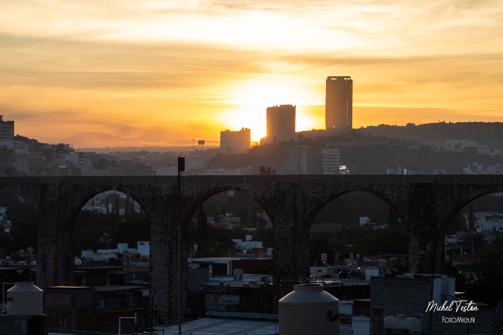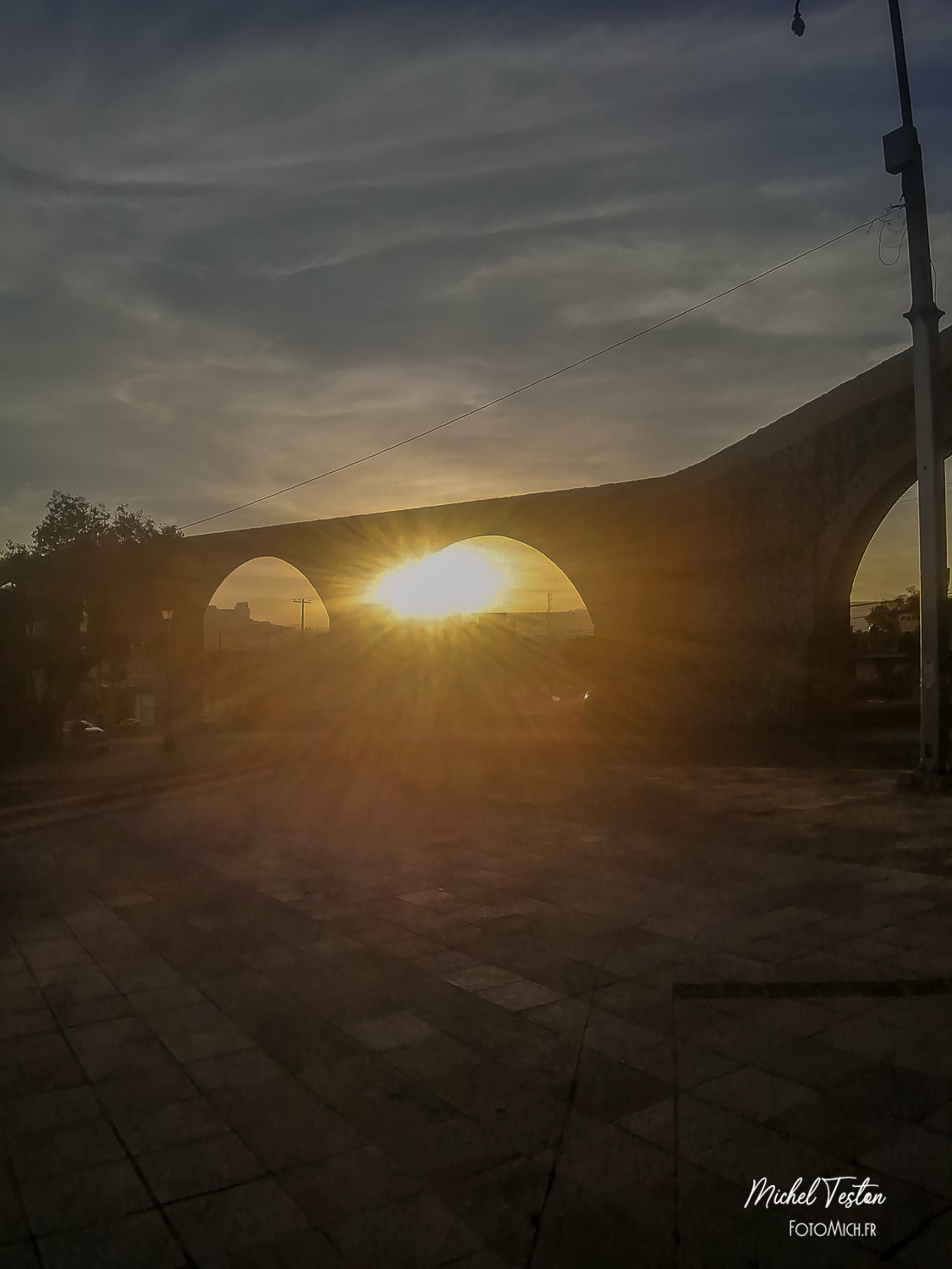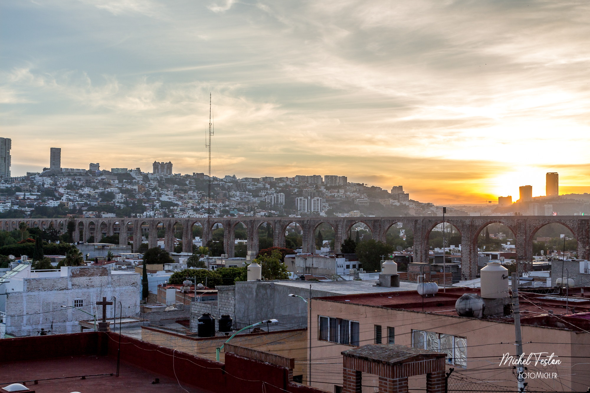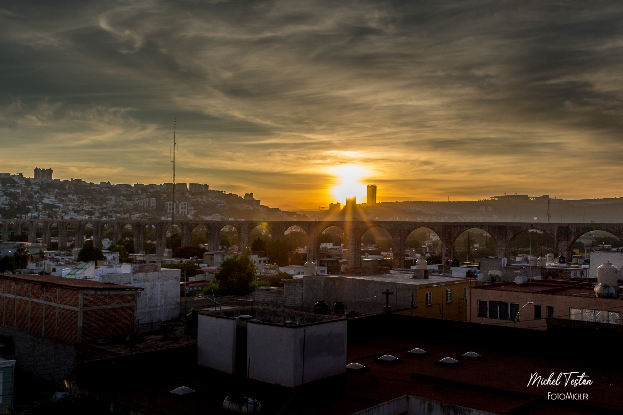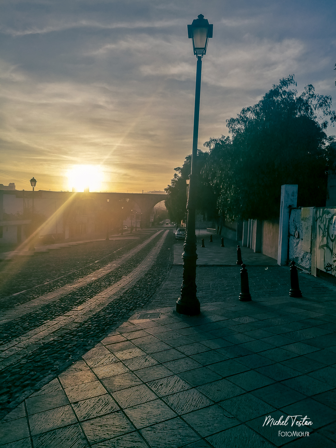 Il fallait trouver un peu de courage pour se lever de bon matin car l’instant est cours dans ce pays. Il fallait aussi que le temps soit au rendez-vous car ces jours ci il faisait gris le matin. Il fallait donc tous ça pour profiter du levé de soleil dans les rue de Querétaro. Profiter un peu tout seul des rues désertiques, du soleil sur les Archos (c’est comme ça qu’ici il appelle l’aqueduc), de profiter des Gravity anciens ou nouveaux qui annoncent la fête des mort.