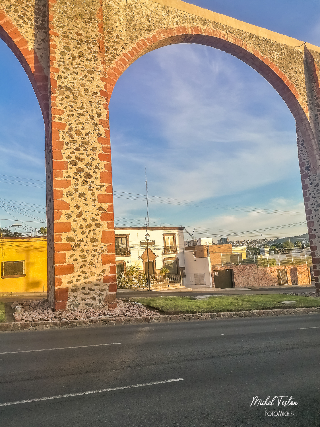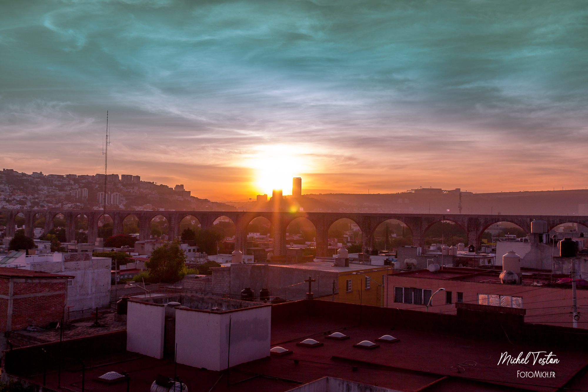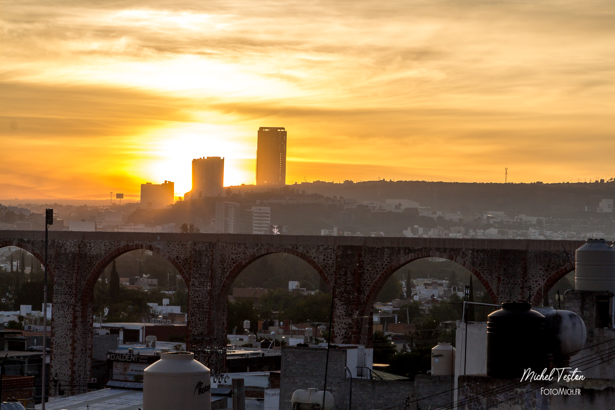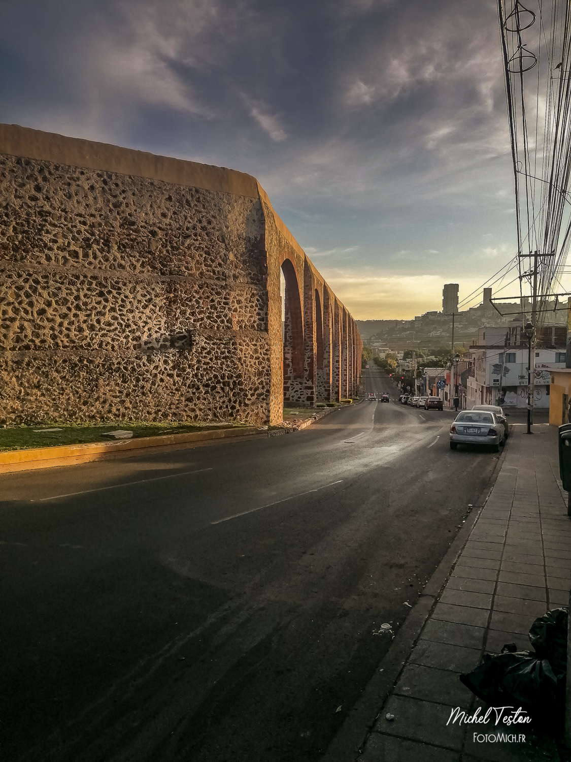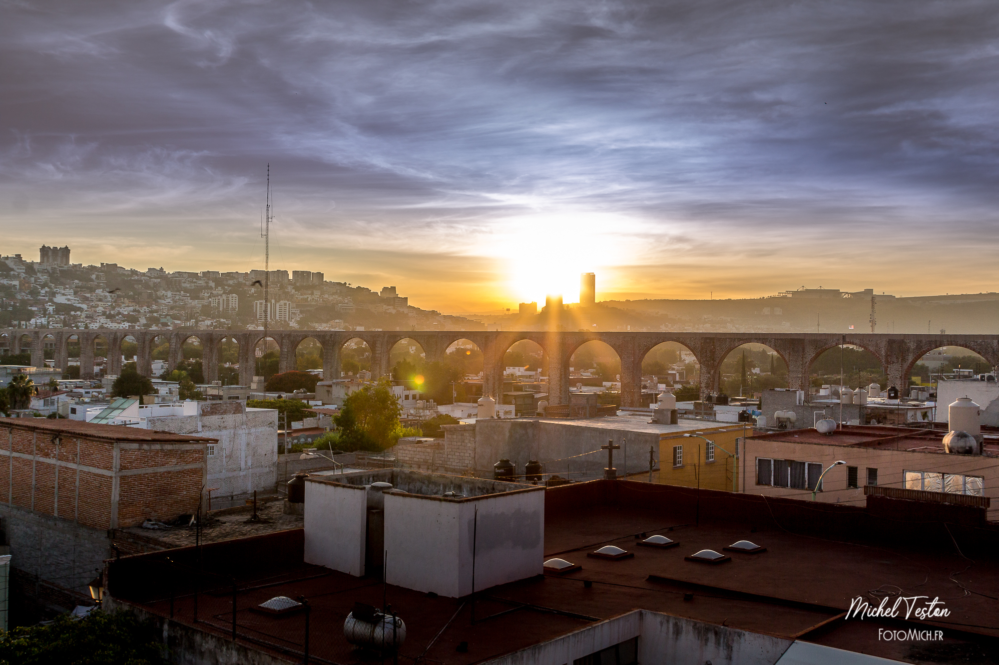 Il fallait trouver un peu de courage pour se lever de bon matin car l’instant est cours dans ce pays. Il fallait aussi que le temps soit au rendez-vous car ces jours ci il faisait gris le matin. Il fallait donc tous ça pour profiter du levé de soleil dans les rue de Querétaro. Profiter un peu tout seul des rues désertiques, du soleil sur les Archos (c’est comme ça qu’ici il appelle l’aqueduc), de profiter des Gravity anciens ou nouveaux qui annoncent la fête des mort.
