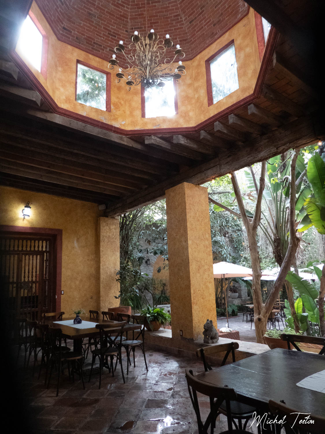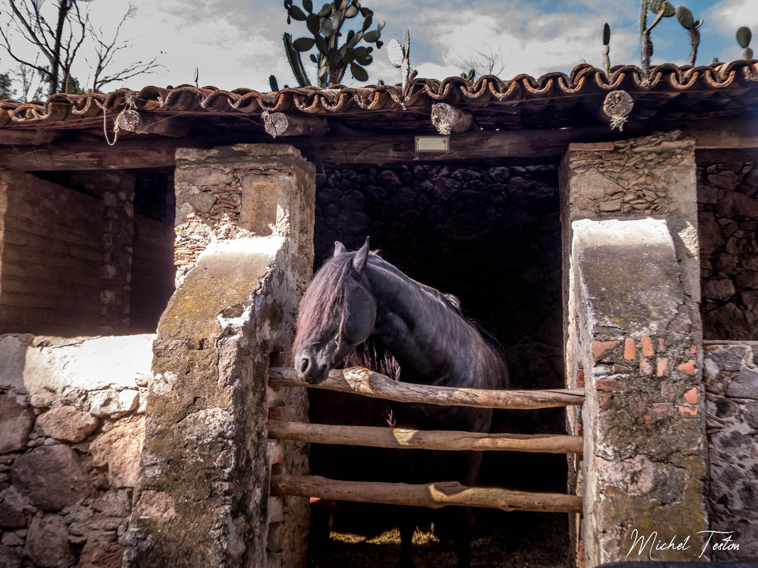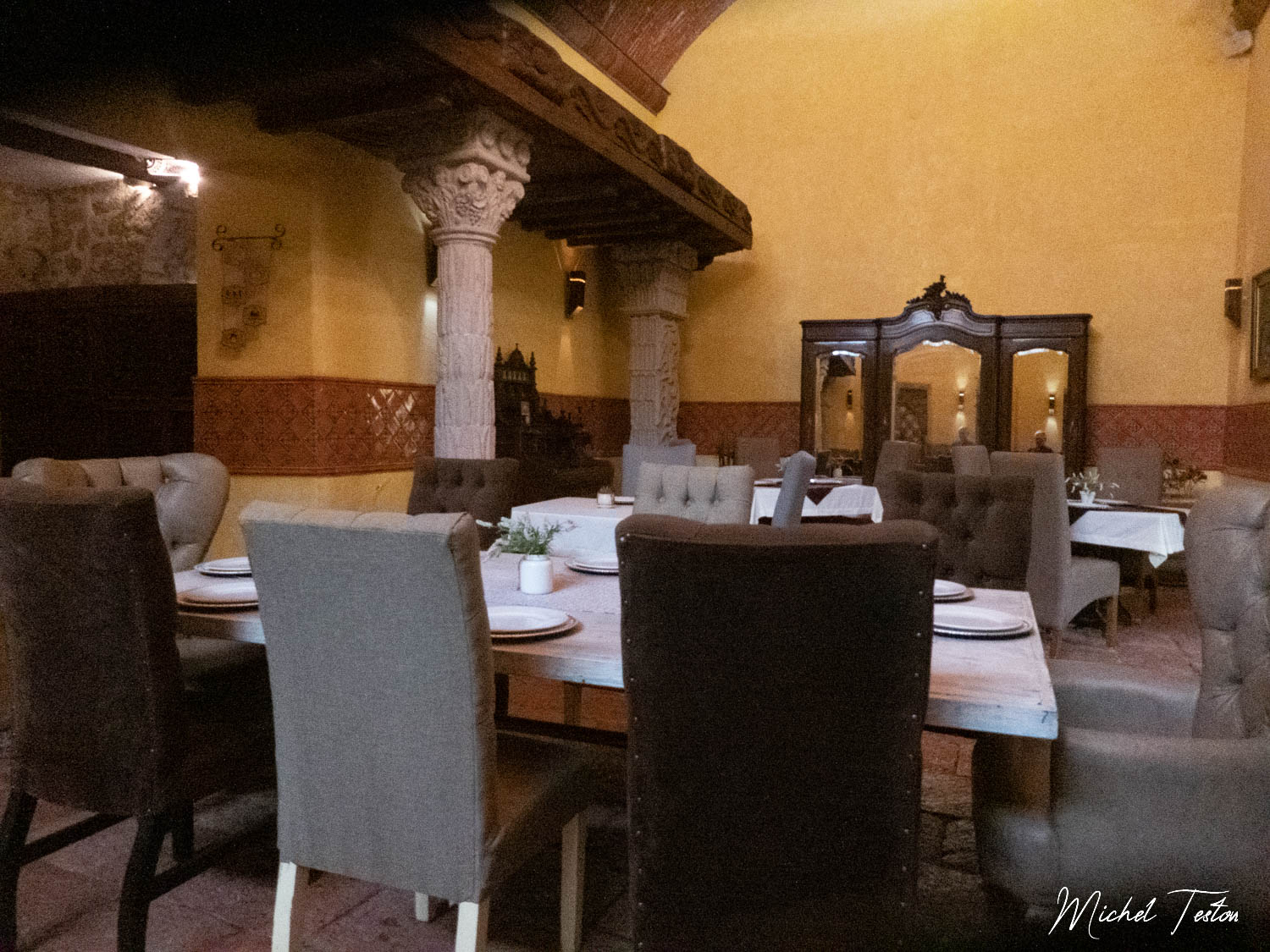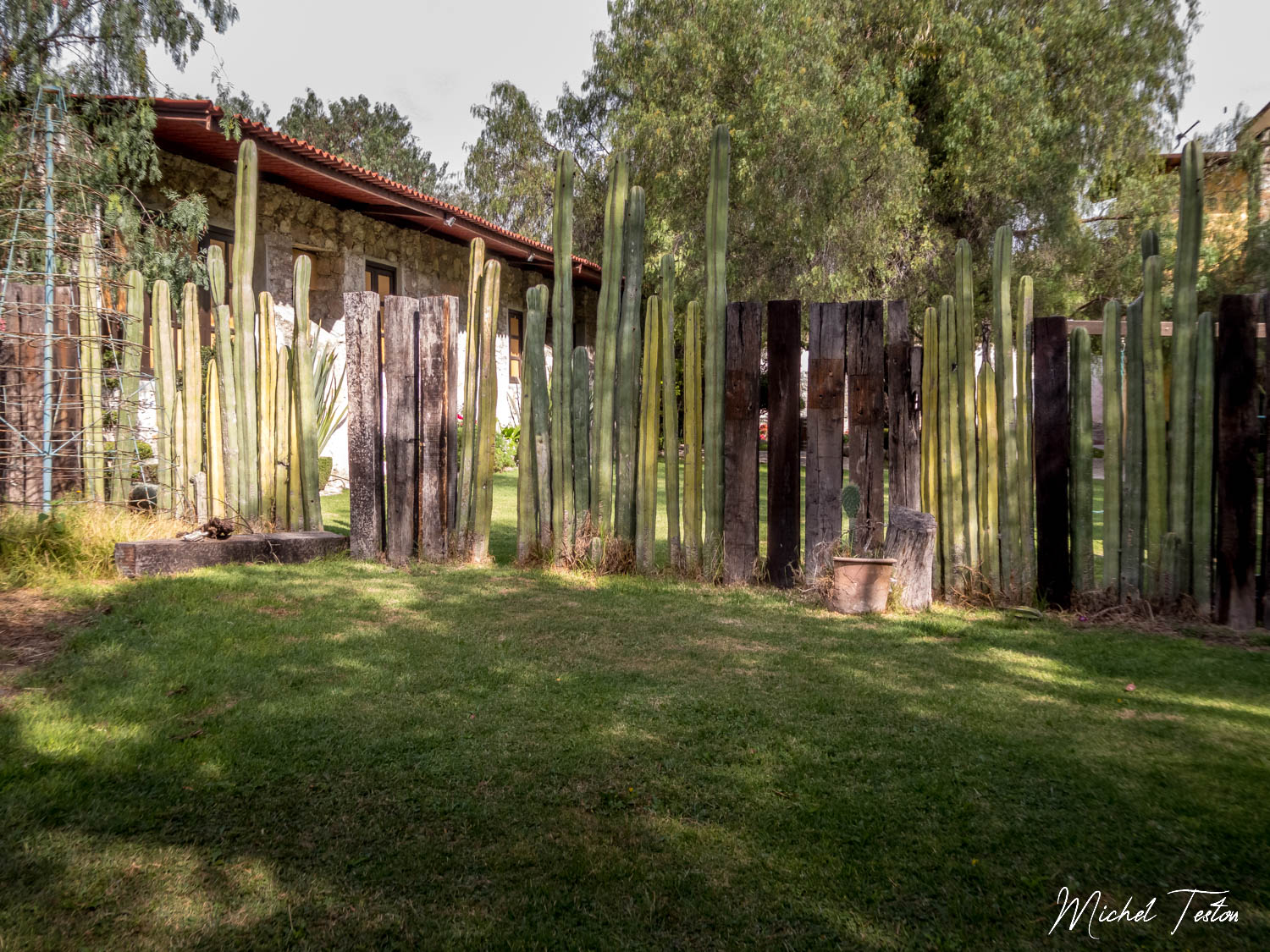 A cote du restaurant il y a un cours intérieure avec une énorme croix avec une couronne en fer. Derrière le passage il y a un magnifique jardin avec d’immense cactus en guise de haie. Sur un coté il y a un espèce de cimetière en désordre et des écuries avec des magnifiques chevaux.