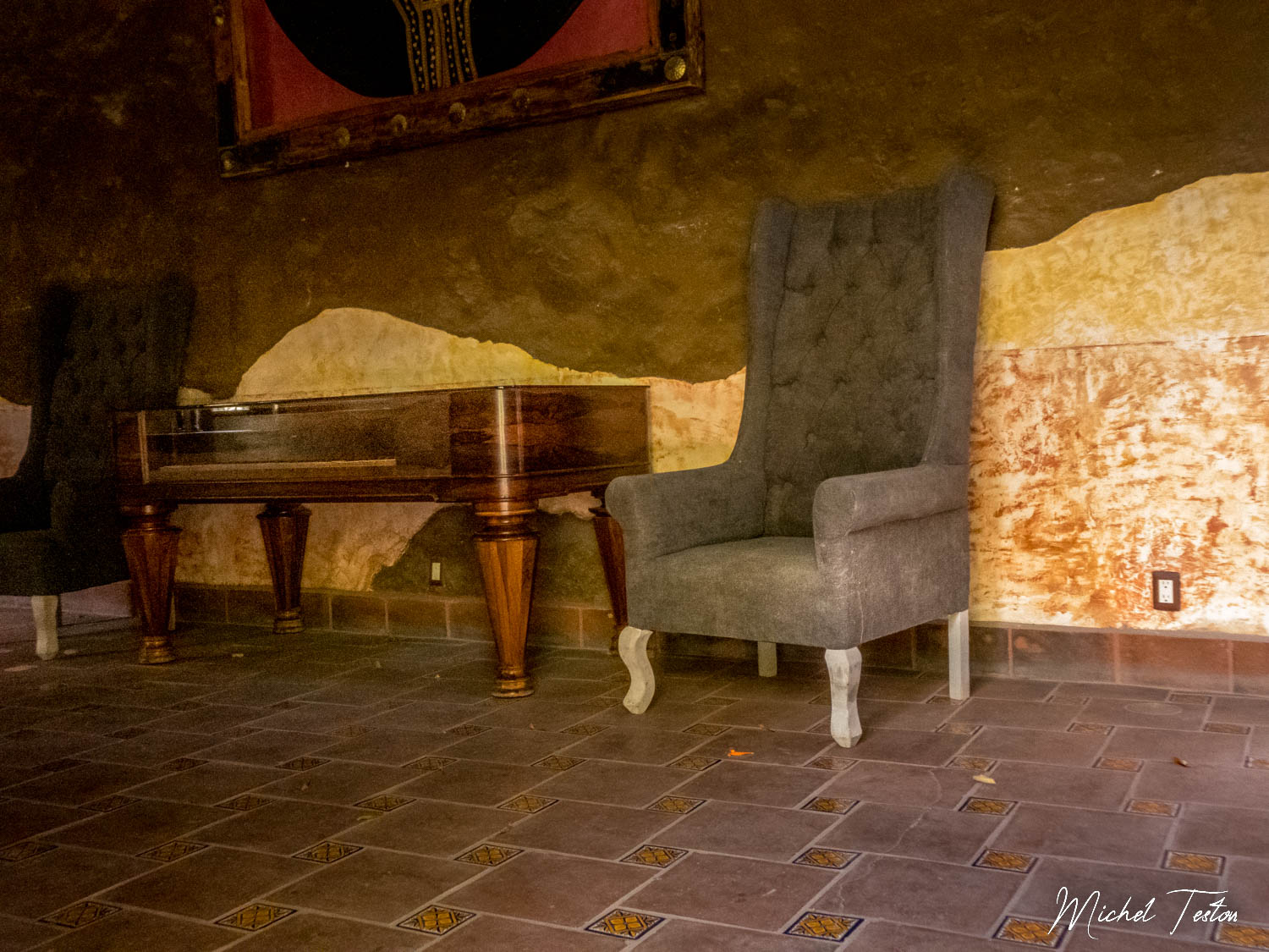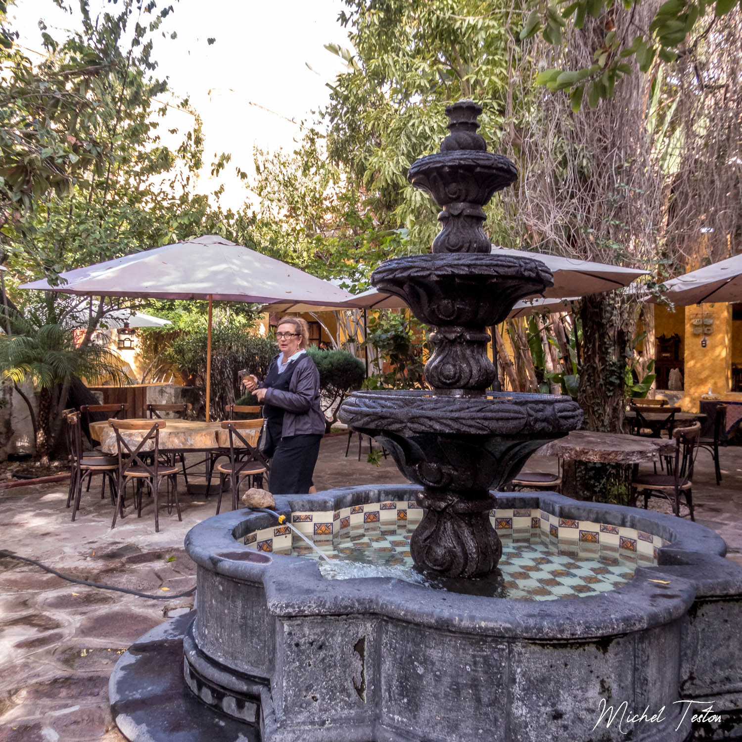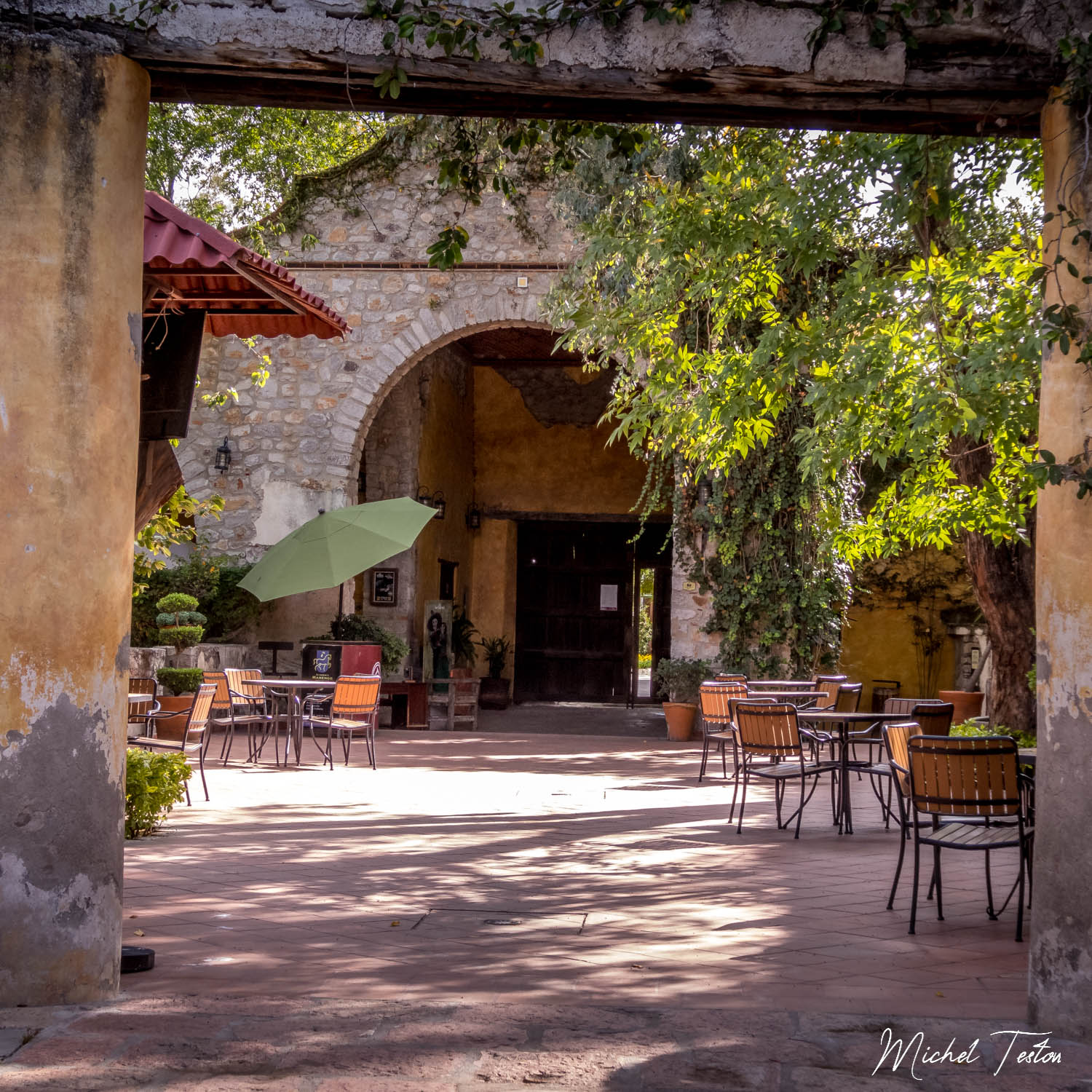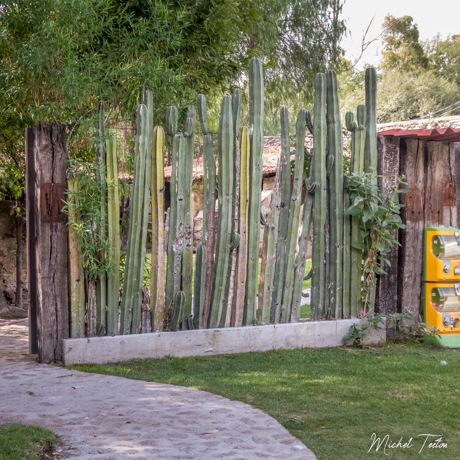 A cote du restaurant il y a un cours intérieure avec une énorme croix avec une couronne en fer. Derrière le passage il y a un magnifique jardin avec d’immense cactus en guise de haie. Sur un coté il y a un espèce de cimetière en désordre et des écuries avec des magnifiques chevaux.