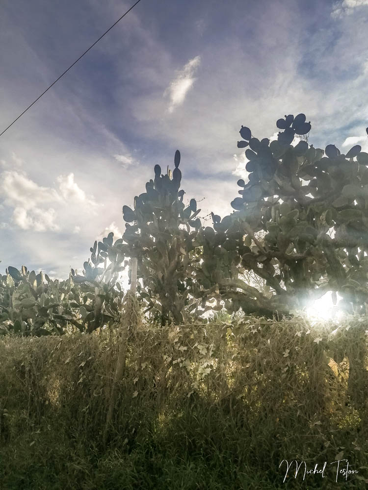 Pour sortir de la ville il y a d’énormes bouchons à cause des travaux sur les voies rapides et les autoroutes de Querétaro. Juste avant d’arriver à San Miguel, on bifurque sur la droite pour rejoindre une piste. Oui, c’est bien une piste avec son lot de trous et de poussières. Une piste qui n’en fini pas longée de cactus grands comme des arbres. Certains sont tellement vieux qu’on dirait qu’ils ont des tronc comme des arbres.