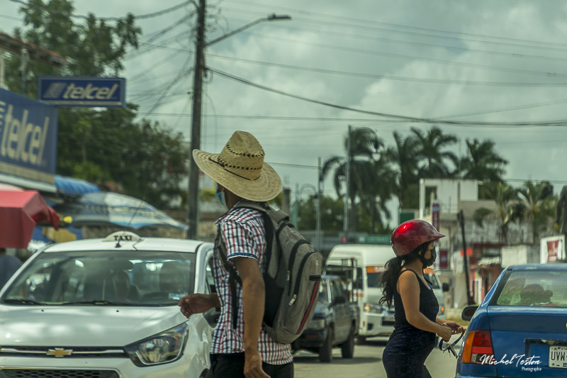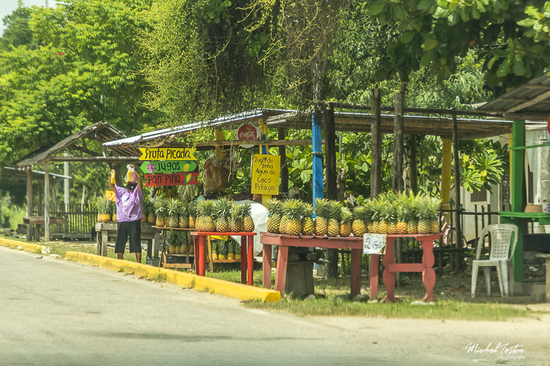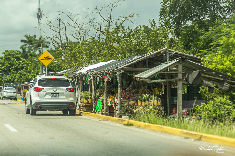Sur la route au niveau des dos d’âne, qui ralentisse la vitesse, il y a plein d’artisans ou de vendeur de fruits ( par exemple 5 ananas pour 50 pesos). Les vendeurs profitent que la voiture ralentie pour se projeter vers la vitre de la voiture, c’est risqué mais ca doit leur permettre de vivre.