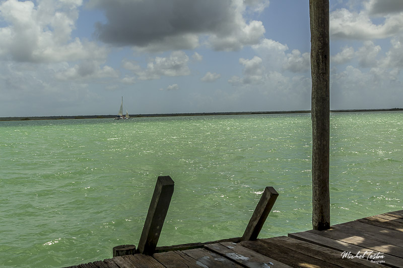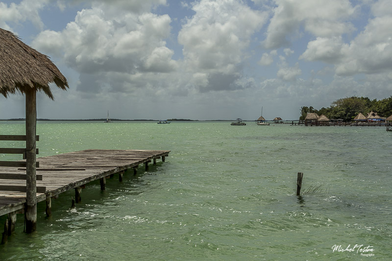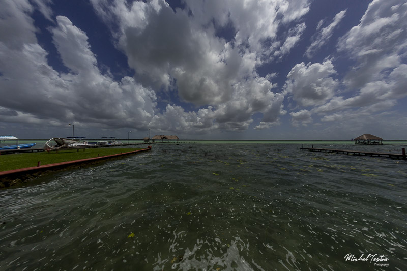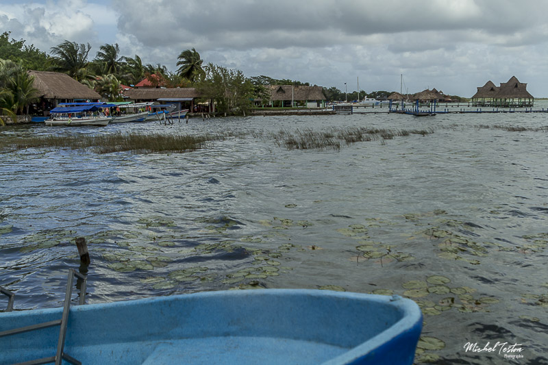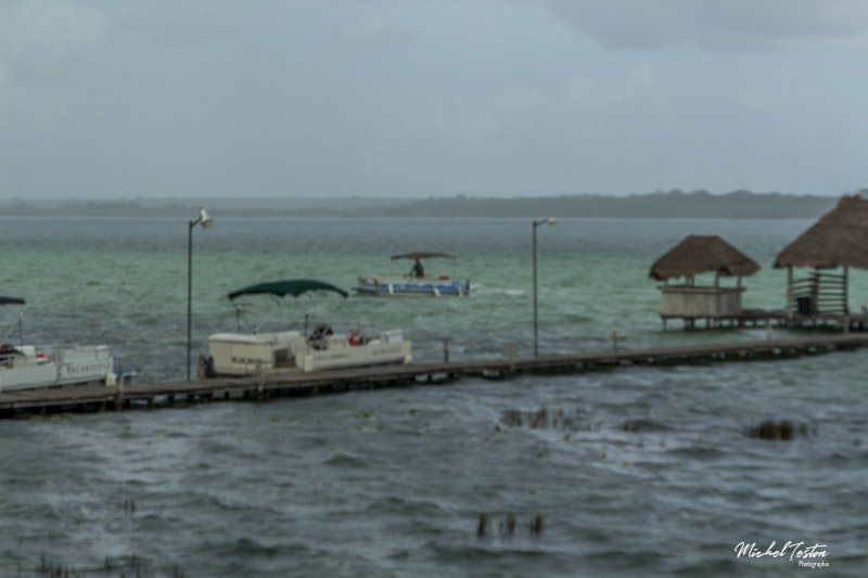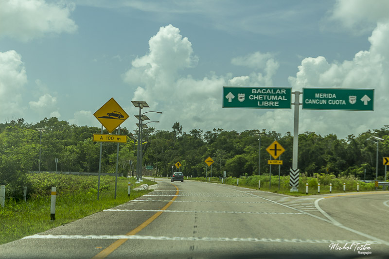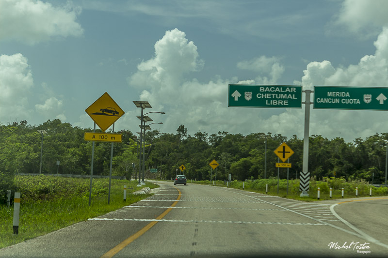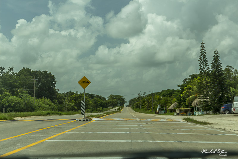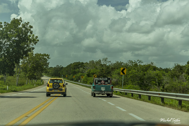 L’itinéraire est simple la route 307 en direction de Chetumal et de la frontière du Belize. Ce n’est implicitement la ville de Bacalar qui nous intéresse mais son lagon au sept nuances de bleu. C’est les derniers jour de la saison des pluies. On en reparlera mais la pluie n’est pas forcement synonyme de mauvais temps,. mais souvent d’une courte pause dans l’excès de température. En tout cas pour moi ! En route on prend donc notre petite averse ( parfois elles sont beaucoup plus grosses!!!) .