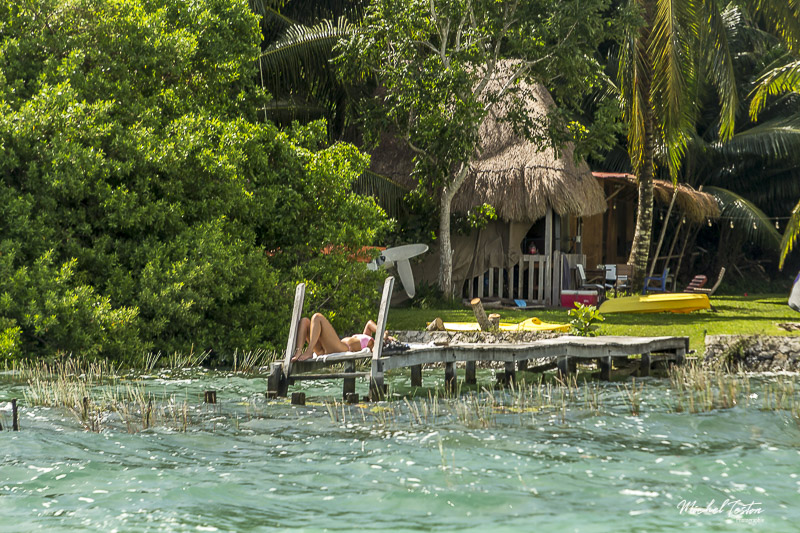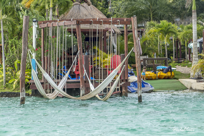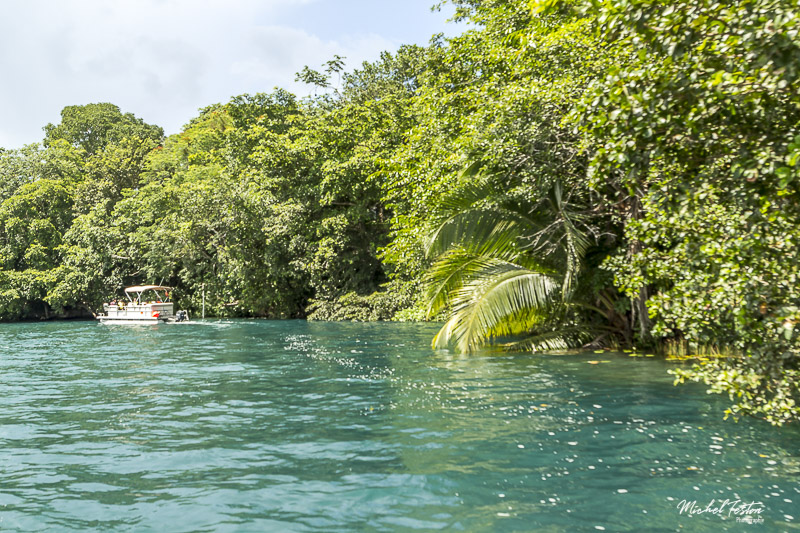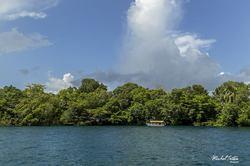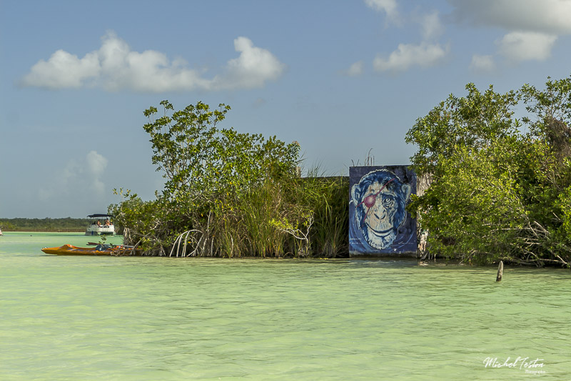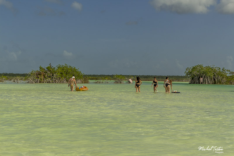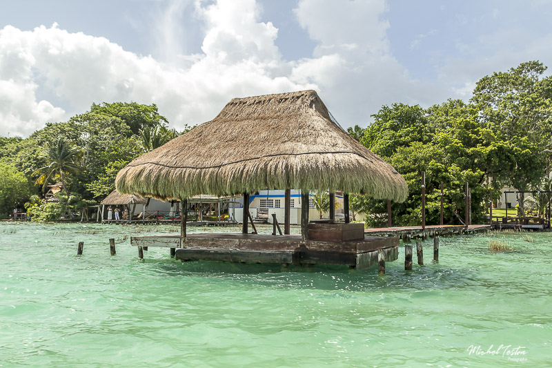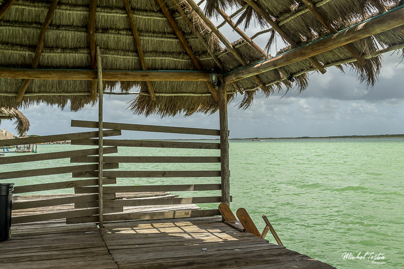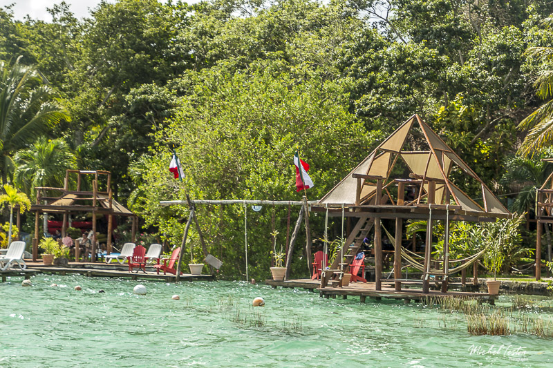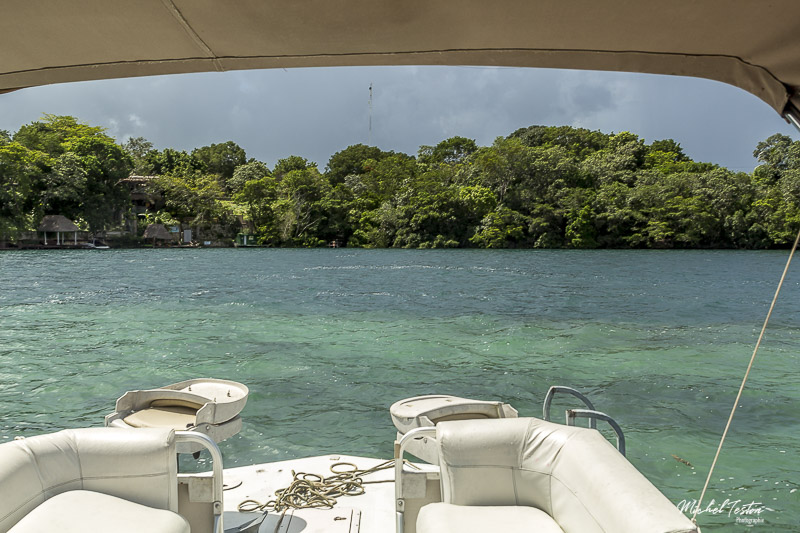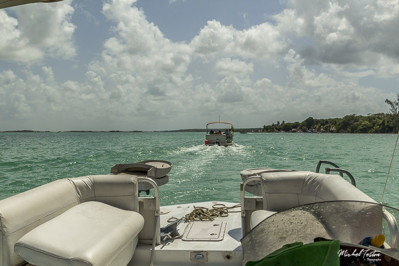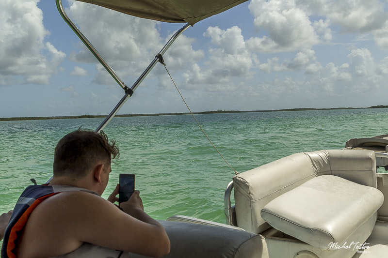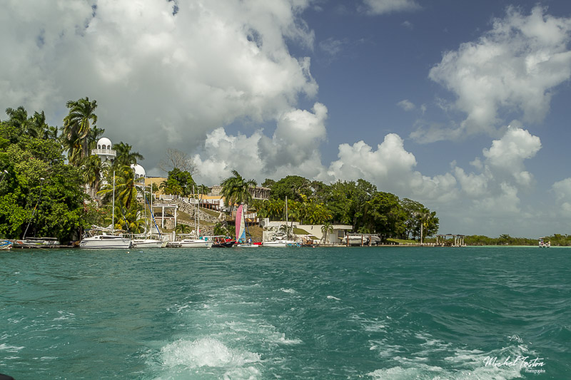 Rapidement on voit arriver au loin la pluie, ce qui nous décourage, mais le serveur nous dit que d’ici dix minutes c’est bon. on est perplexe mais c’est lui le local de l’étape. Et effectivement moins de dix minutes plus tard, la pluie est passé et le soleil brille à nouveau. Le bateau arrive et c’est parti pour deux superbes heures sur ce lagon qui fait 42 km de long par 2 kilomètres de large. Au programme se sera passage sur les trois cenotés du lagon ( et oui les trous d’eau ce n’est pas que dans la jungle, dans le lagon aussi), les hôtels “instagramable”, les villas de luxe, le passage des pirates et pleins d’autres anecdotes.